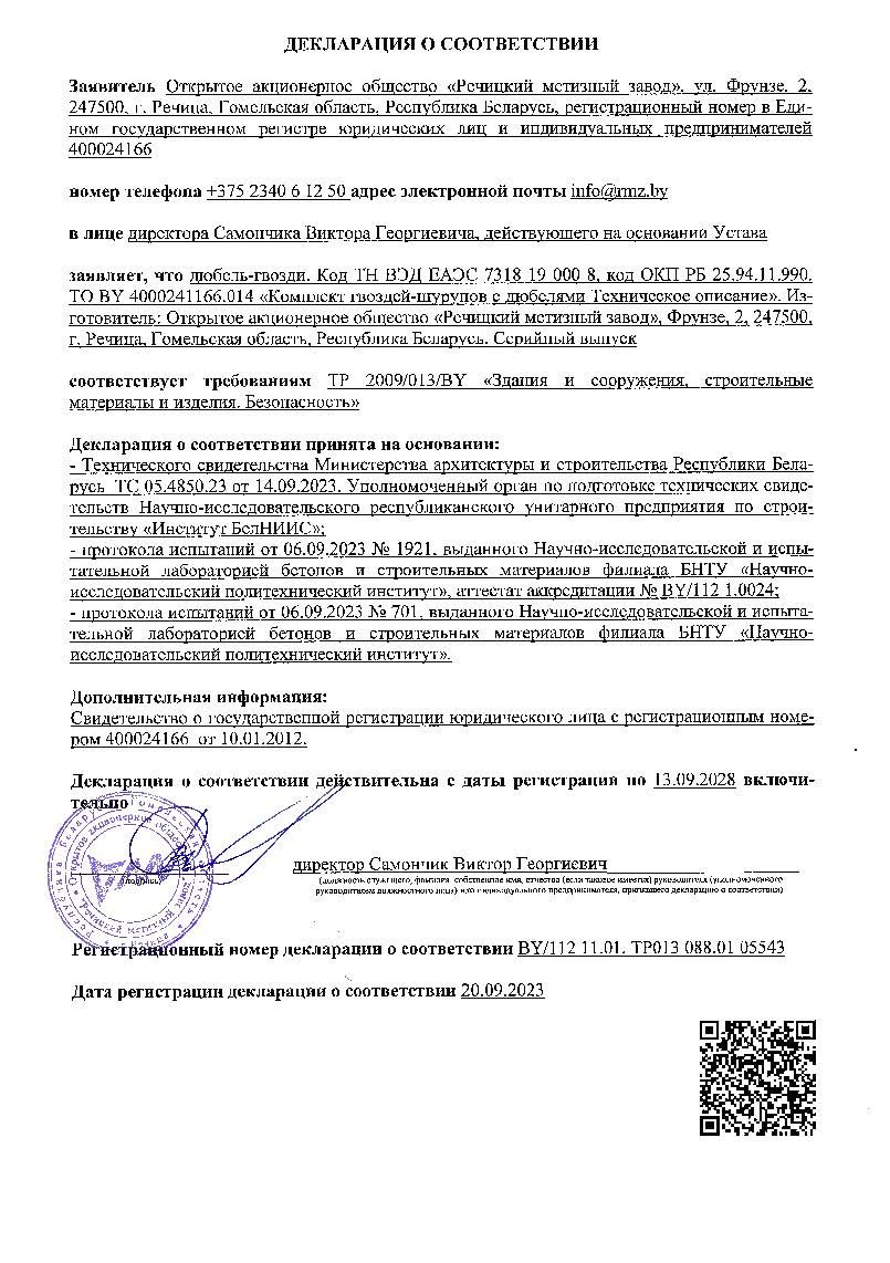 Производитель ОАО "Речицкий метизный завод", 247500, Республика Беларусь,Гомельская обл., г. Речица, ул. Фрунзе, 2